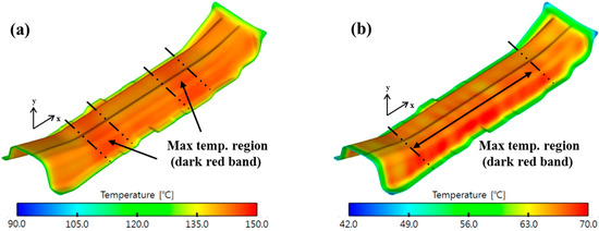 Figure 9 shows the HPF simulation results of the temperature distribution of the blank when the upper and lower dies are opened at a holding time of 12 s. For the conventional die, the maximum temperature of the blank is about 150 °C and its region is where there are no cooling channels in the upper and lower dies (Figure 9a). The minimum temperature region of the blank is at the edge and the difference between the maximum and minimum temperatures is about 60 °C. On the other hand, for the slice die, the maximum blank temperature is about 70 °C and the high temperature region is evenly distributed throughout the blank (Figure 9b). The minimum temperature region of the blank is at the edge, which is the same as in the previous case, and the maximum temperature and the minimum temperature difference is about 28 °C.
