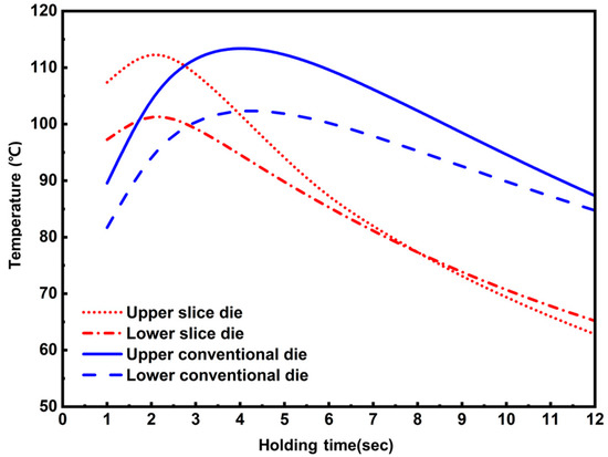 Temperature change at the contacted area with the blank in the conventional and slice dies according to holding time.