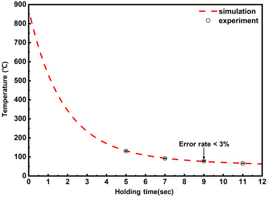 To validate the slice die cooling performance shown in Section 4.1, an actual slice die was prototyped and blank temperature was measured at a holding time of 5, 7, 9, and 11 s. Figure 11 shows the comparison of blank temperature from the simulation (red line) and the experimental (black circle). Very good agreement is observed between the simulation and experiment results. At the holding time of 5, 7, 9, and 11 s, the error rate of the simulation and experiments are 0.9%, 1.3%, 2.9%, and 0.6%, respectively and the overall error rate is within 3%. As far as the blank temperature in the conventional die is concerned, the temperature was about 130 °C at a holding time of 12 s.