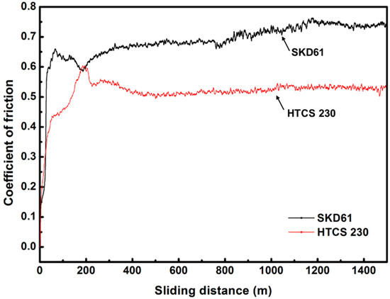 Figure 12 shows the friction test results of SKD61 and HTCS230 materials that were used in conventional dies and slice dies, respectively at 250 °C. The friction tests were conducted at a relative humidity of air of 50 ± 5%. The temperature of 250 °C is the risen temperature due to the accumulation of heat in the part of the conventional die when it produces about 100,000 parts. The friction behavior of both materials varies greatly from 0 to 200 m due to wear debris. The conventional die material (SKD61) has a larger average friction coefficient than that of the slice die material (HTCS 230). For the slice die material (HTCS 230), the coefficient of friction converged after 500 m without fluctuation, whereas the friction coefficient of the conventional die material (SKD61) continuously increased with relatively high fluctuation in the 200–1200 m range of sliding distance. Hence, SKD61 has better friction resistance at 250 °C than HTCS230.