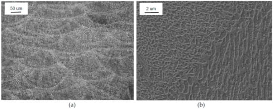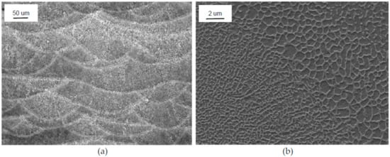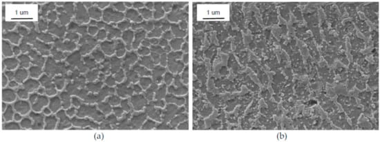 High magnification observations revealed, in both conditions, the presence of a very fine cellular solidification structure consisting in submicrometric primary α-Al cells decorated by a network of Si. Figure 1b and Figure 2b also show that, when crossing the boundary of the melt pools, the size of the cells is subjected to a clear change, due to reheating effects produced by the overlaying passes [4], and to local changes in solidification conditions [13]. The comparison between cold and hot platform microstructure, proposed in Figure 3, highlights, by higher magnification views, that the Si network is substantially continuous in the CP samples (Figure 3a), while it becomes broken, combined with an additional intracellular precipitation of tiny particles, in HP samples (Figure 3b). It is presumed that the longer holding period at high temperature results in higher diffusion, leading to spheroidization phenomena in the Si network and precipitation of supersaturated Si atoms at cell interiors. This hypothesis is in good agreement with the results published by Li and co-authors, who investigated the precipitation of Si atoms into nano- or micrometric particles from supersaturated solid solutions in a SLM-processed AlSi10Mg alloy [13].