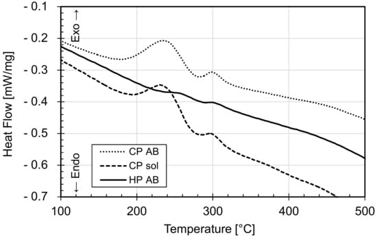 DSC curves of as-built and of solution-annealed samples have been collected in order to evaluate the aging potential of the AlSi10Mg alloy, starting from different conditions. Figure 6 displays representative profiles of the heating ramps within the temperature range, where precipitation of strengthening phases is expected. The solution-annealed sample (CP sol) shows the sequence of precipitation peaks according to accepted literature [18,22,23,24,25]. The DSC curve of the as-built sample produced on a cold platform (CP AB) shows a similar shape, suggesting that most of the strengthening potential of the alloy can be exploited by thermal aging, starting from the as-built state, without the need of any prior solution-annealing treatment. On the contrary, the curve of the as-built sample produced on hot platform (HP AB) only shows a very limited response to the thermal ramp, confirming that most of the precipitation already occurred during the hot-stage manufacturing process.