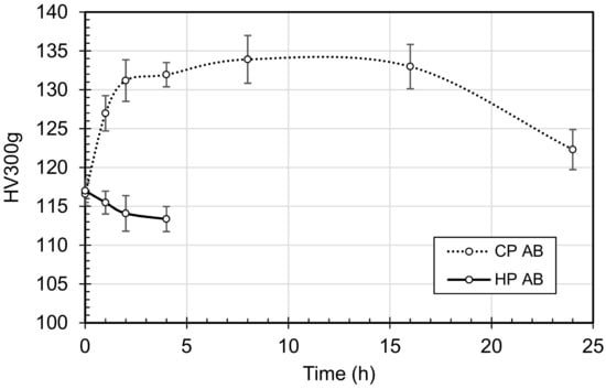 The evolution of Vickers’ microhardness of as-built samples, as a function of holding time at the aging temperature of 160 °C, is depicted in Figure 7. In full agreement with DSC data, it is reported that aging starting from CP AB condition produces a clear hardening, with an increase in microhardness from 116 to 134 HVn. Conversely, aging of the hot platform-processed samples led to a slight loss in hardness, from 117 to 113 HVn, after 4 h of aging at 160 °C. Thus, it can be reasonably inferred that further aging of HP AB alloy can only induce stress relaxation and/or overaging effects, without any improvement in mechanical properties.