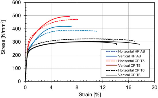 Finally, as far as the effect of specimen orientation is concerned, there is evidence from tensile data that CP T5 and HP AB samples tested in the horizontal direction always feature higher yield strength and fracture elongation, but lower ultimate tensile strength. On the contrary, solution annealing and aging (CP T6) led to the best yield and ultimate strength values in the horizontal samples, but comparable ductility for the two directions.