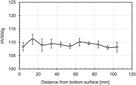 A further issue to be considered when comparing cold and hot platform-printing strategies is the effectiveness of the in situ aging process in the latter situation. From DSC and microhardness results, it is inferred that HP AB samples do not show any significant response to aging under DSC heating ramps, and are even subjected to a slight loss in hardness on isothermal aging (see Figure 7). This suggests that overaging effects could take place in the samples, and it is reasonable to speculate that the actual aging effect promoted by hot platform processing would depend on printing time and on the position of the reference volume along the part height. Indeed, material volumes close to the build platform are subjected to longer processing times than those located close to the upper surfaces of the part. The volume of printed parts should also play a role, since thin parts featuring a lower re-melted area and higher fraction of relatively cold powder surrounding it would experience shorter holding times at high temperature than bulky shapes. A simple experimental test was designed in this perspective, measuring the microhardness profile along a sectioned vertical cylindrical bar (10 mm in diameter, 100 mm in length) produced by the hot platform strategy. The profile, reported in Figure 9, shows that no significant trend can be envisaged, at least for the bar size and the alloy investigated here. A similar experiment was also performed by Maamoun and co-authors [21], who showed, for the same AlSI10Mg alloy, an increasing hardness trend with increasing distance from platform. However, their samples were only 10 mm high along the z direction, and the SLM process was performed by a build platform temperature of 200 °C, instead of the 160 °C used in the present investigation.