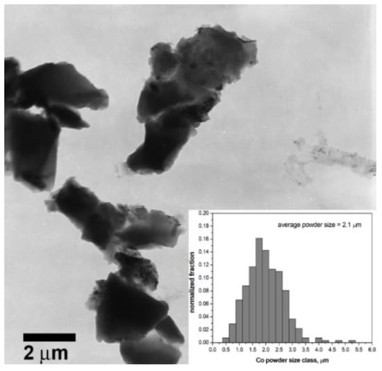 TEM (transmission electron microscope) extraction image showing the cobalt starting powder dimension; inset shows the powder size distribution obtained from 350 measurements performed on TEM.