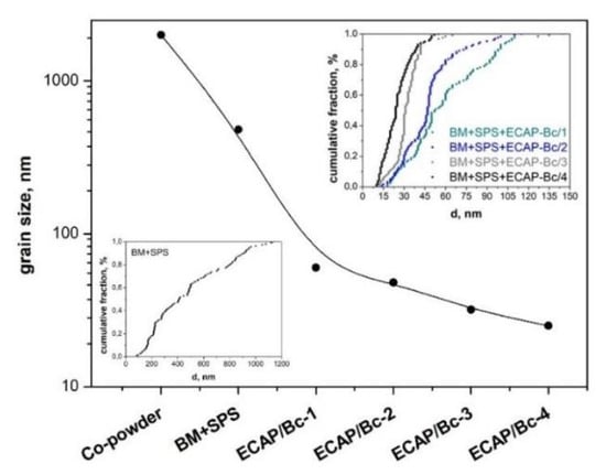 Grain size vs. deformation processes, i.e., ball-milling (BM) + spark-plasma sintering (SPS) (bottom-up process) and BM + SPS + equal-channel angular pressing (ECAP)-BC/1–4 (top-down process). Insets report the grain size distribution of the bottom-up BM + SPS (left-hand side) and the bottom-up + top-down BM + SPS + ECAP-BC/1–4 (right-hand side).