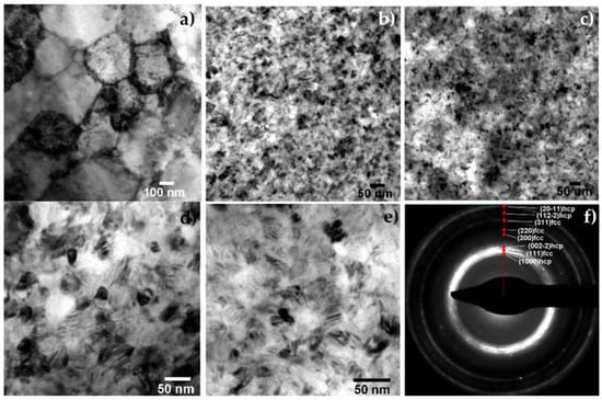 In the present study, it appeared that ECAP straining induced a phase rearrangement between the existing fcc and hcp phases. In fact, as reported in Figure 3b–e, TEM inspections showed a lamellar substructure with a high density of nanotwins and stacking faults, which is consistent with the low stacking-fault energy of Co []. A highly faulted microstructure, composed of a high concentration of stacking faults/twins, was observed in particular after three and four ECAP-BC passes; these are consistent with the low stacking-fault energy of cobalt.