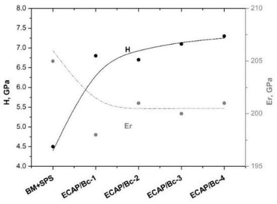 On the other hand, the local elastic modulus, Er, did not depend on the grain size reduction induced by the top-down ECAP process. In fact, Er reduced by 3% from BM + SPS to the first ECAP pass and did not further reduce with cumulative ECAP straining, as shown in Figure 4.