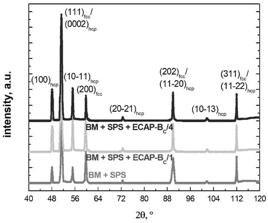 XRD patterns of BM + SPS (bottom-up process), BM + SPS + ECAP-BC/1, and BM + SPS + ECAP-BC/4 (top-down process). The 15-0806 (for fcc-Co) and 5-0727 (for hcp Co) JCPOS SPDD Metals and Alloys reference datasheets were used.
