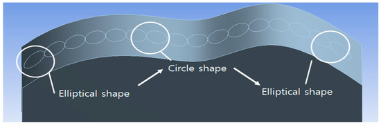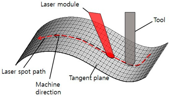 And, all experiments were repeated three times and the mean values of cutting force, specific cutting energy and surface roughness were measured. The machining conditions were recommended by cutting tool manufacturer (WIDIN Co., Ltd., Changwon, Korea), and various spindle speeds and feed rates are applied to analyze the effect of spindle speed and feed rate in the conventional machining (CM) and LAM. Figure 12 shows change of laser heat source according to curved shape. Table 6 shows experimental condition for LAM.