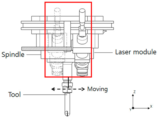 Figure 3 shows a schematic diagram of ramp milling method. Also, in ramp milling with LAM, it is necessary to control the laser heat source because changing the machining direction from the +X direction to the −X direction requires that the laser heat source also be changed in the same direction. To resolve this issue, an additional axis module was equipped on the spindle. The additional axis is the U axis corresponding to the X axis and V axis corresponding to the Y axis. It can be controlled by NC code in conjunction with NC code. In this study, when the direction of the X axis was changed, the U axis was moved in advance to control the laser heat source. Figure 4 shows additional axes of on the laser module. Figure 5 shows laser heat source moving method in ramp milling method.
