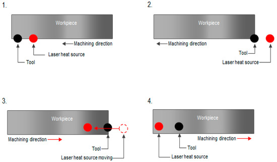 Laser heat source moving method in ramp milling. (1. During machining, the laser heat source is located in front of the tool, 2. After machining, the laser heat source is located behind of the tool, 3. During the machining direction is change, the laser heat source is moved using the additional axis of the laser module (U-axis moving), 4. During machining, the laser heat source is located in front of tool).