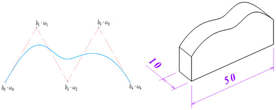 The third NURBS curve with m unit sections has (m + 3) adjustment points, (m + 3) weight, and (m + 4) knot vectors. The is the basis function of the B-spline. Where the role of the weight is to pull the curve toward the adjustment point and change the curve. In this study, the shape of the third NURBS curve is weight 2 in and and the other weight is 1. The length and thickness of the mechanical model are 50 mm and 10 mm, respectively [22].
