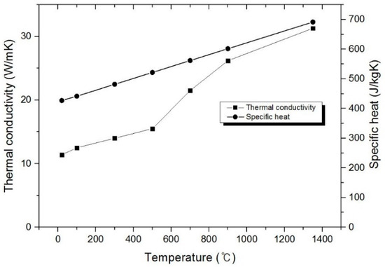 where q, h, T and represent heat flux, heat transfer coefficient, surface temperature and ambient temperature, respectively. A thermal analysis was carried out to determine the workpiece surface temperature. The thermal conductivity and specific heat of Inconel 718 based on the temperature are shown in Figure 7.