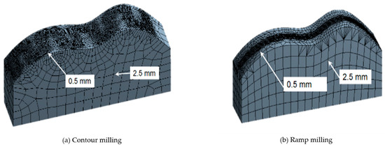 Finite element analysis models of contour milling (a) and ramp milling (b).