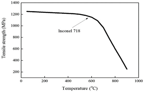 Tensile strength of Inconel 718 according to temperature (reproduced from [24], with permission from ELSEVIER, 2010).