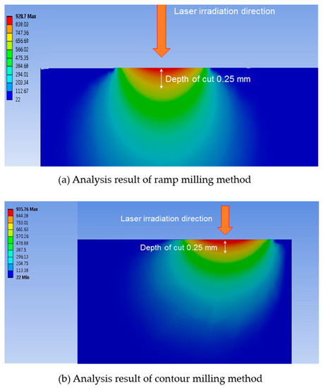 Using the FEM analysis, the results for preheating temperature and depth of cut of Inconel 718 were obtained. Figure 9 shows the tensile strength of Inconel 718 according to temperature [24]. According to the results of FEM analysis, the preheating temperature was 938.87 °C in contour milling and 928.7 °C in ramp milling. The preheating temperature and the laser power was determined to be 940 °C and 100 W. This is because a temperature of about 940 °C suitable for reducing the residual stress caused by the heating of Inconel 718 as shown in Figure 10. Consequently, in the contour and ramp milling, the preheating temperature was determined to be 940 °C and the effective depth of cut was determined to be 0.25 mm.