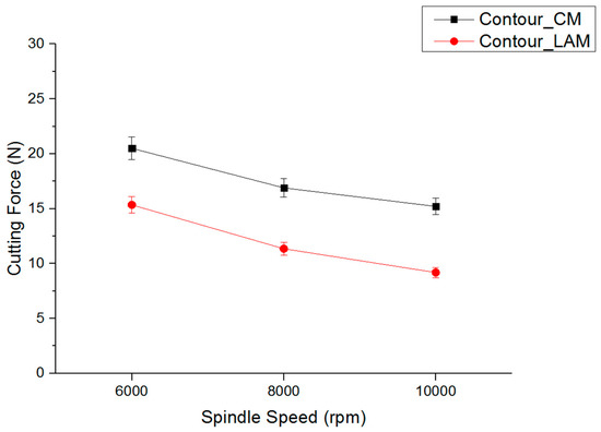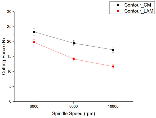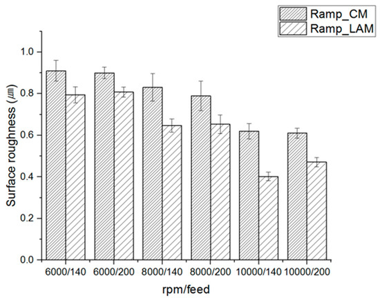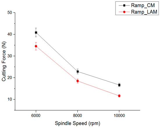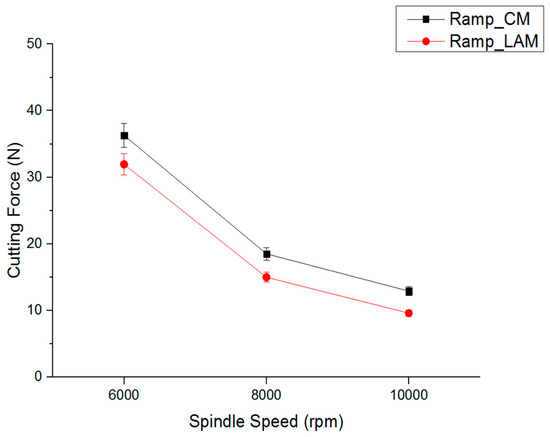 The ramp milling machining experiment was carried out by applying conventional machining and LAM under various machining conditions. The ramp milling method of experiment results shown in Figure 15 and Figure 16. The spindle speed was 6000 rpm, 8000 rpm, and 10,000 rpm at feed rate 140 mm/min, the cutting force was reduced by 12.1%, 19.18%, and 25.6%, respectively, compare to CM. The spindle speed was 6000 rpm, 8000 rpm and 10,000 rpm at feed rate 200 mm/min, the cutting force was reduced by 15.5%, 19.8% and 33.7%, respectively, compared to CM. At spindle speed of 10,000 rpm, the cutting force was decreased by the greatest extent. In totally, the cutting force was decreased as the spindle speed increased.