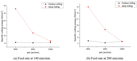 Specific cutting energy of feed rate at 140 mm/min (a) and feed rate at 200 mm/min (b) with LAM.