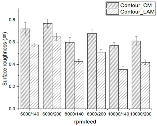 Surface roughness is measured by a shape measuring machine. For the two machining methods, it was found that lower the feed rates resulted in better surface roughness. When the conventional machining results were compared and LAM. The spindle speed was 6000 rpm, 8000 rpm and 10,000 rpm at feed rate 140 mm/min, the surface roughness was reduced by 20.8%, 15.71%, and 29.33%, respectively, in the contour milling. At feed rate 200 mm/min, the surface roughness was reduced by 25%, 38.59%, and 31.14%, respectively, in the contour milling. In the ramp milling, at feed rate 140 mm/min, the surface roughness was reduced by 11.11%, 13.18%, and 17.34%, respectively. At feed rate 200 mm/min, the surface roughness was reduced by 22.89%, 22.95%, and 35.4%, respectively. Figure 18 shows the measured surface roughness results in contour milling method. Surface roughness was also better with a lower feed rate and a higher spindle speed for the contour milling method. Figure 19 shows measured surface roughness results in ramp milling method. At the feed rate 200 mm/min and at the spindle speed 8000 rpm, the decrease rate of surface roughness was highest by 38.59%.