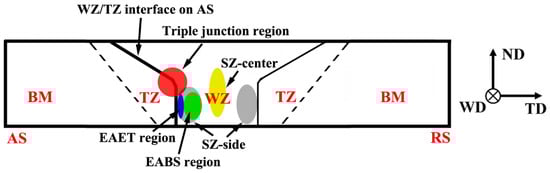 Nevertheless, the authors believe that several weak zones related to texture exist in FSW Mg alloys, including the WZ/TZ interface, SZ-side, triple junction region and SZ-center. The approximate locations of weak zones are presented in Figure 1. The weak zones related to texture have an impact on the mechanical properties and fracture behavior of FSW Mg alloys.