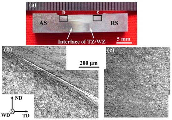 Interfaces between the TZ and WZ of FSW Mg alloys: (a) macro photo; (b) the interface in AS; and (c) the interface in RS [].