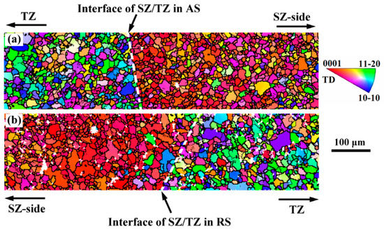 EBSD orientation maps of the SZ/TZ interfaces in FSW AZ31 alloy: (a) AS; and (b) RS [].
