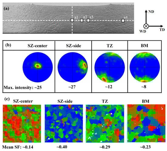 In addition to grain refinement, a strong texture is formed in FSW Mg alloys [,,,,,]. Textures in typical regions of FSW AZ31 plate are presented in Figure 4 []. The corresponding positions are shown in Figure 4a. Significantly different textures are found in various regions (see Figure 4b). BM shows a typical characteristic of hot-rolled Mg-alloy plate with the c-axis parallel to the normal direction (ND). SZ-center (position of a1 in Figure 4a) shows the c-axis of most grains perpendicular to the TD, while SZ-side (position of a2) presents a texture with the c-axis nearly parallel to the TD. Basal slip and extension twinning are most easily activated at room temperature for Mg alloys due to the low CRSS [,]. The activation of basal slip and extension twinning can be predicted by SF values based on EBSD data. Figure 4c shows that SZ-side has the highest SF value (~0.4), while SZ-center presents the lowest SF value (~0.14). The results indicate that basal slip is easily activated in SZ-side and hardly activated in SZ-center. Therefore, SZ-side would be a weak zone for FSW Mg alloys, compared with the SZ-center as well as the BM.
