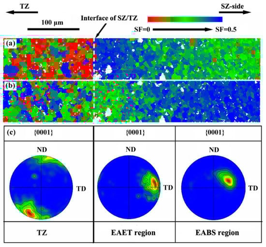 Based on the SF values, SZ-side can be divided into two micro-regions. One is the Easy to Activate Extension Twinning region (EAET region), which is close to the SZ/TZ interface. The other is slightly away from the SZ/TZ interface, named as the Easy to Activate Basal Slip region (EABS region). {0001} pole figures of various micro-regions are presented in Figure 5c, indicating that the c-axis is inclined about 10° towards TD in EAET region, while it is inclined about 40° towards TD in EABS region. It confirms that it is easy to activate extension twinning in the EAET region, while it is easy to activate basal slip in the EABS region during transverse tensile tests []. In addition, it is found that EAET region is very narrow, only about 100 μm wide along the TD (see Figure 5). The activation of different deformations in such a narrow zone of SZ-side may cause plastic deformation incompatibility and initiate fracture. The results fully confirm that SZ-side is a weak zone of FSW Mg alloys.