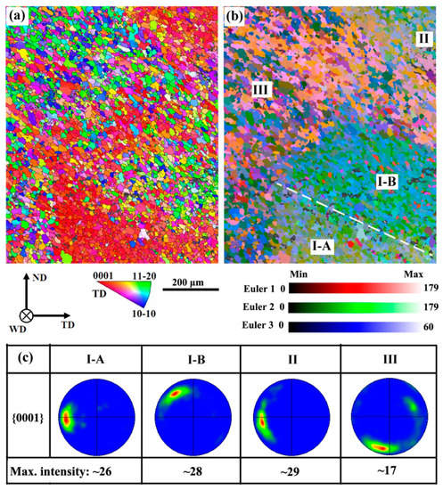 Based on the texture distributions, the triple junction region may be divided into four parts: Regions I-A, I-B, II and III (see Figure 6b). Figure 6c shows that the c-axis is inclined about 19° towards TD in Region I-A, while it is inclined about ~56° towards TD in Region I-B. The angles between the c-axis and TD in Regions II and III are ~22° and ~78°, respectively. It is noted that the c-axis of grains in Region I-B has rotated toward ND compared with Region I-A. Therefore, it is speculated that the formation of triple junction region has a close relationship with screw threads of stir tool []. The screw threads extrude the materials in Region I-B with a vertical stress during FSW, which causes the c-axis of grains in Region I-B rotated toward the ND. However, the detailed formation mechanism of triple junction region is still unknown.