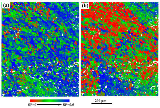 To deeply understand the weak factors from the viewpoint of local texture in SZ-side, SF maps of extension twinning and basal slip in SZ-side of FSW AZ31 alloy are studied based on EBSD data. Figure 5 shows that a narrow region in SZ-side close to the SZ/TZ interface presents the highest SF value for extension twinning (the blue zone in Figure 5a). A relatively wide region, which is slightly away from the SZ/TZ interface, shows the highest SF value for basal slip (the blue zone in Figure 5b). The results indicate that dominant deformation mechanisms in SZ-side are changed from extension twinning to basal slip as the region moving away from the SZ/TZ interface [].