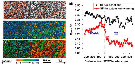 EBSD orientation maps of the SZ/TZ interface in FSW AZ31 alloy with a subsequent rolling strain of 2.5%: (a) band contrast map with extension twin boundaries indicated by red lines; SF map for basal slip (b) and extension twinning (c); and (d) variation of SF values as a function of the distance from the SZ/TZ interface [].