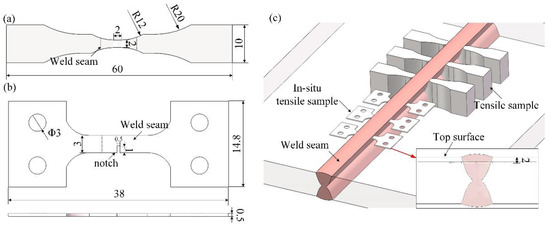 (a) Shape and size of butt joint tensile sample; (b) Shape and size of in-situ tensile sample; (c) Schematic diagram and distribution of tensile samples. (unit: mm)
