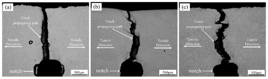 To identify the fracture path and the relationship between microstructure and mechanical properties, an in situ tensile test was conducted and the results are discussed below. Figure 9 illustrates low-magnification images of the fracture propagation path of the joints produced at different heat inputs. When the heat input was 2.2 × 103 J/cm, the fracture propagated in a straight line perpendicular to the tensile direction. With the increase of the heat input, the fracture path became serrated and irregular, as shown in Figure 9b,c.