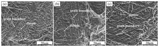 Figure 10 displays SEM images of the fracture surfaces at low magnification. As shown in Figure 10a, a large number of uniform dimples were observed, indicating that the fracture morphology had the characteristic of ductile fracture. However, when the heat inputs were high, many stripe-like planes were presented, as shown in Figure 10b,c. High-magnification SEM images of the fracture patterns are illustrated in Figure 11. Obviously, the morphologies of the dimples significantly changed with the increase of heat input. Under low heat input, shown in Figure 11a, the fracture surface dimples belonged to stretch and equiaxial types. As the heat input increased, the fracture surface exhibited stretch and tearing elongation-type dimples. The above fracture morphologies were also researched by Matsumoto et al. [25]. It can be concluded that when there is relatively high heat input, the main fracture mode involves microcracks that form at the crystal boundary under exogenic action, and visible microvoids are generated by the aggregation of adjacent microcracks. Subsequently, the microvoids grow, proliferate, and finally connect to each other to form a fracture.