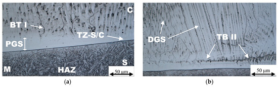 - Although there is martensite in the transition zone of the substrate/clad, this zone does not present a high density of finely dispersed carbides (MC, M7C3, and M23C6 type), this being very beneficial to its ductility and fracture toughness;