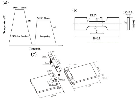 (a) Schematic diagram of diffusion bonding and tempering treatment of 9Cr martensitic/ferritic heat-resistant steel with an electrodeposited Ni interlayer; (b) schematic drawing of tensile specimen; (c) schematic drawing of clamping method.
