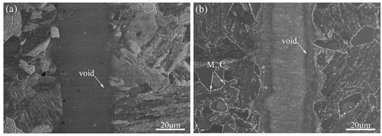 Figure 2 shows the interfacial microstructure of the diffusion-bonded joints before and after tempering treatment. The intermediate part is the interlayer of nickel and the contrast was opposite to that of the microstructures on both sides of the intermediate layer. Lath martensite and a small amount of δ-ferrite compose the microstructures on both sides of the intermediate layer. Two types of precipitates are usually formed along lath martensite and prior austenite boundaries during the tempering process, mainly M23C6 and MX [24]. M23C6 carbide and MX carbonitride facilitate the dispersion strengthening of 9Cr martensitic/ferritic heat-resistant steels during heat treatment [14,25,26,27]. MX carbonitride is much smaller than M23C6 carbide. M23C6 carbides are mainly distributed along lath, block, packet, and prior austenite grain boundaries, while MX carbonitrides are mainly distributed in the lath. Thus, the precipitates along the boundaries were identified as M23C6 type carbides, shown in Figure 2b. In addition, few voids were observed in the region adjacent to parent materials on both sides of the Ni/steel interface and no crack occurred in the joint region.