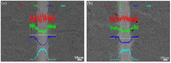 Back-scattered electron (BSE) scanning electron microscopy (SEM) micrographs of the joint interface with qualitative line analysis: (a) prior to tempering treatment and (b) subject to tempering treatment. The white line indicates the energy dispersive X-ray spectroscopy (EDS) line scanning area across the joint.