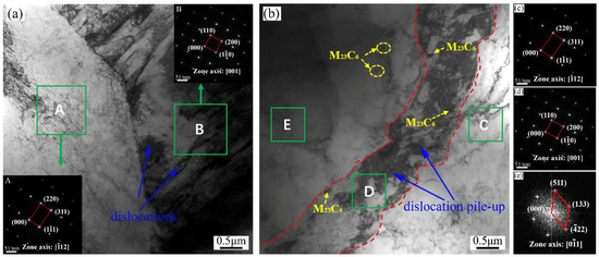 To reveal more details about interfacial microstructure, Figure 4 presents TEM images of the joint region before and after tempering treatment. No intermetallic compounds and reaction products were observed, as shown in Figure 4. This is in good agreement with the reported information of the binary phase diagrams for Fe–Ni and Cr–Ni [30]. At 1050 °C, which is higher than the austenization temperature of martensitic/ferritic steel, the material transforms into austenite, leading to the formation of many prior austenite boundaries. The formed prior austenite boundaries can accelerate the grain boundary diffusion of the alloying elements as additional diffusion paths [20]. In addition, it has been reported that nickel diffuses faster than iron and chromium in stainless steel alloys [20]. Referring to binary phase diagrams for Fe–Ni, Ni-rich solid solutions of the (γFe,Ni) forms along both sides of the bonding interface in the parent materials, which would promote good bonding between steels and interlayer. During cooling after diffusion bonding, austenite will transform into martensite laths, as shown in Figure 4a. A high density of tangled dislocations in martensite laths was also found due to large lattice distortions during martensite transformation. Meanwhile, Ni-rich solid solutions retained austenite structure, as nickel element promotes austenite stability at room temperature. Nevertheless, the austenite structure adjacent to the solid solution in steels is metastable because of less enrichment in nickel content, so it would transform into martensite at room temperature. After tempering treatment, the prior martensite transformed into tempered martensite composed of a ferrite matrix with carbide precipitates. Although massive carbide particles precipitated along the prior austenite and martensite lath boundaries during the tempering treatment, the dislocation density in martensite laths reduced significantly due to dislocation recovery. As shown in Figure 4b, the microstructure in region C is retained austenite according to the selected-area diffraction pattern (SADP). It is also the (γFe,Ni) solid solution rich in nickel, as confirmed by EDS analysis, listed in Table 3. Additionally, regions D and E consisted of tempered martensite. The interface in region D still had a higher density of dislocations and less nickel content, since the dislocation recovery was hindered by solute atoms [31]. This elucidates that nickel atoms diffuse faster and concentrate in steels, resulting in the formation of Ni-rich solid solutions.