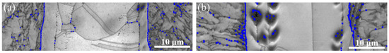 Corresponding band contrast (BC) maps from an area of joint region: (a) prior to tempering treatment and (b) subject to tempering treatment.