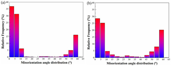 Misorientation angle distribution: (a) prior to tempering treatment and (b) subject to tempering treatment.