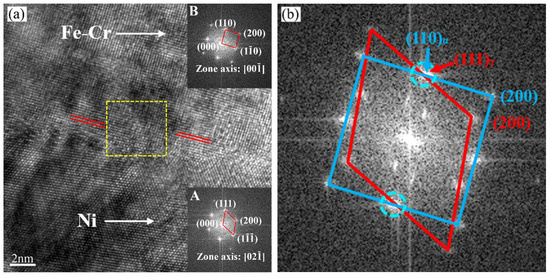 High-resolution transmission electron microscopy (HRTEM) observation of the joint interface subjected to tempering treatment and the corresponding FFT diagram: (a) HRTEM image at Ni/steel interface; (b) corresponding FFT diagram of the region marked with a yellow rectangle in (a).