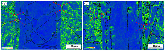 Martensite transformation would produce a high density of dislocations during the bonding cooling process. Then, the dislocation density in the tempered martensite would decrease after tempering treatment. Kernel average misorientation (KAM) maps were used to evaluate the dislocation density by changes in local orientation. KAM calculated the average misorientation surrounding a measurement point with respect to a defined set of nearest or nearest plus second-nearest neighbor points, representing a density of geometrically necessary dislocations [35]. The KAM distribution of samples before and after tempering treatment is given in Figure 9. As shown in Figure 9a, the joint region without tempering shows high KAM values, which contains a high dislocation density. The distribution of KAM values almost keeps invariant close to the bonding interface in steels, while KAM values and dislocation density both show a moderate downward trend in other regions after tempering treatment. This indicates that the dislocation density close to bonding interface in steels is almost the same, due to the pinning effect of solute atoms. This promotes appreciable solid solution strengthening along the joint interface during the post–weld heat treatment. The retained austenite along the joint interface would relieve the local stress concentration and reduce the chance of microcrack formation in the steel during deformation [36].