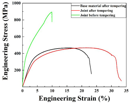 Tensile stress–strain curve of the base material after tempering and the joint before and after tempering.