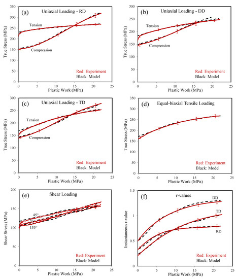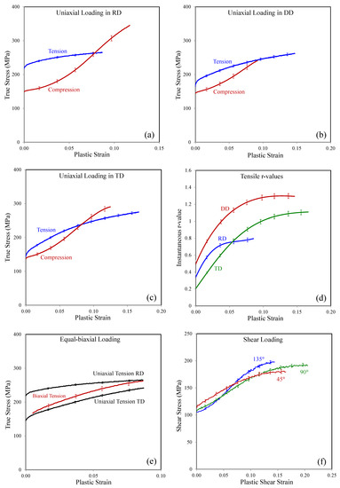 The response of the material under an equal-biaxial tension state was also determined using through-thickness compression experiments under the assumption that yielding is independent of the pressure [11,38]. Note that the modelling approach used in the subsequent sections is based on the CPB06 framework that ignores pressure sensitivity in the plastic response of the material. The result of the equal-biaxial tensile response is shown in Figure 2e in which the uniaxial tensile response of the material in the rolling direction (RD) and transverse direction (TD) are also presented for comparison purposes. It can be seen that the equal-biaxial response of the material lies between that of the uniaxial tensile states in the RD and TD. In addition, Figure 2f presents the behavior of the material undergoing shear deformation in which anisotropy is apparent in terms of the initial yield strength and hardening rates. The experimental results shown in Figure 2 show the challenging nature of ZEK100-O in terms of modelling and characterization and highlight the need for accurate constitutive plasticity models that can capture the evolving anisotropy of the material.
