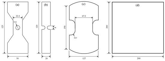 Specimen geometries of (a) hole tension; (b) notch tension; (c) plane-strain dome; and (d) equal-biaxial dome tests. All dimensions are in millimeters.