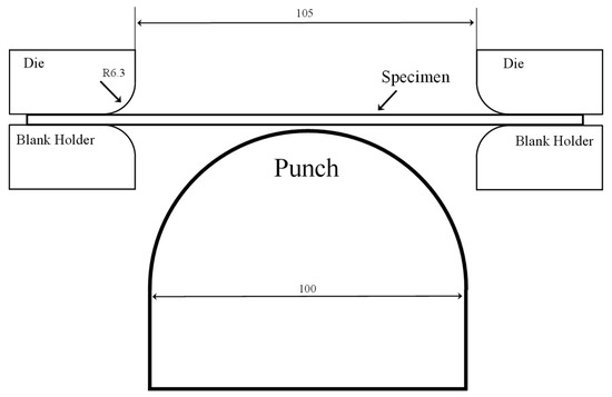 Limiting dome height tests, proposed by Nakazima et al. [56], are standard experiments used for formability characterization of materials. In these tests a blank is clamped between a die and a binder and a hemispherical punch forms the specimen until failure. The blank geometries, shown in Figure 4c,d, conformed to the ISO12004-2 standard and were formed within an MTS hydraulic press with the tooling depicted in Figure 5. Dome tests with the specimen geometry shown in Figure 4c lead to a nearly plane-strain state at the center of the specimen. Furthermore, equal-biaxial tests were performed with the square blank depicted in Figure 4d. Dome tests involve tensile and compressive stress states, an advantage that assists with better evaluations of the tension-compression asymmetric predictions of the developed plasticity model. Moreover, compared to the in-plane tensile tests, the stress states in the dome tests are expected to remain closer to plane-stress conditions, providing a good assessment of the model in these states of stress.