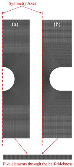 Meshed models of (a) hole tension and (b) notch tension tests considering quarter symmetry. Axes of symmetry are shown in the figure while the other symmetry plane is through the mid-plane of the thickness.